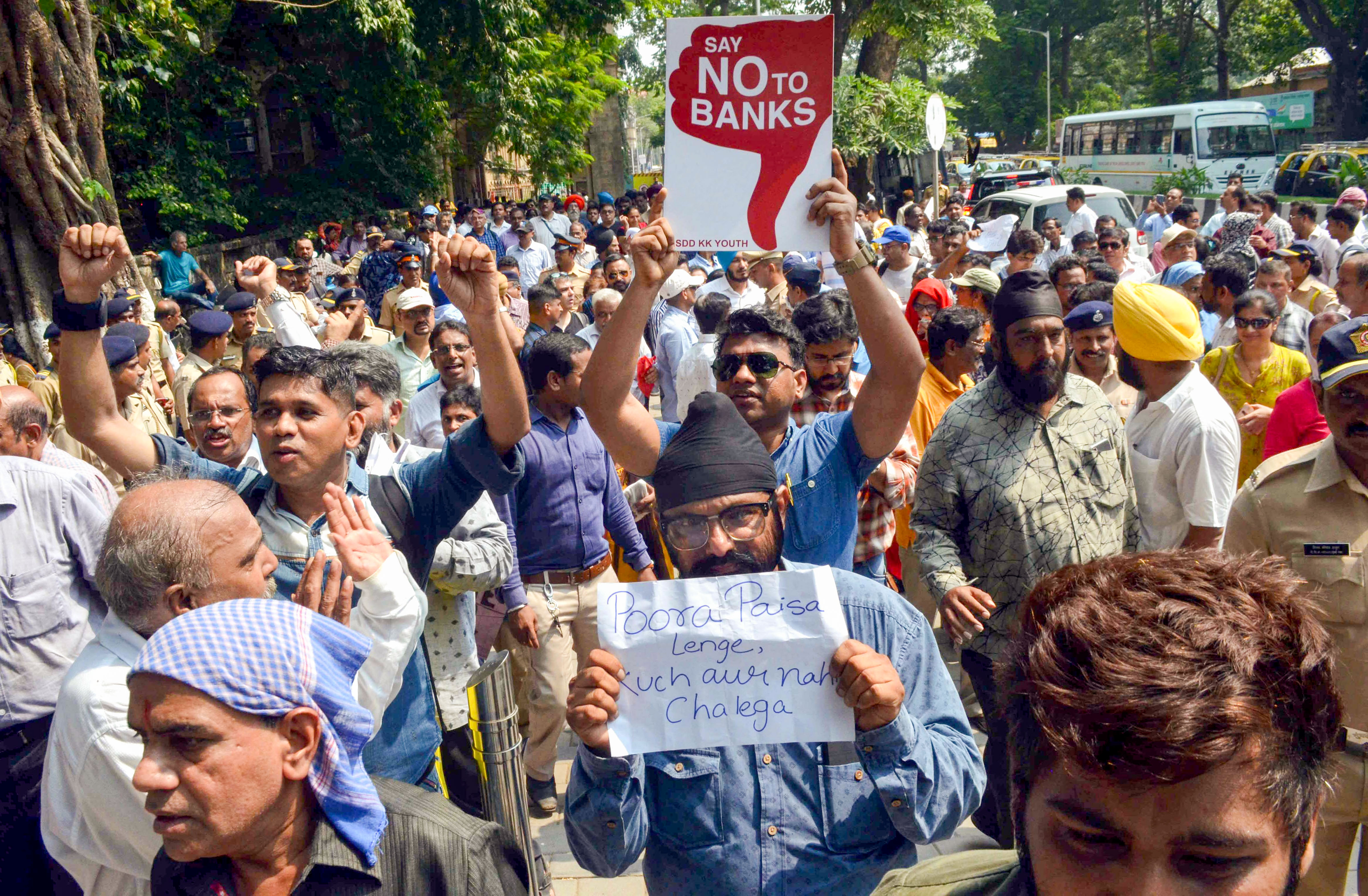 PMC Bank customers stage a protest outside the Killa Court, where the accused of the bank scam were being produced, in Mumbai. (Source: PTI)