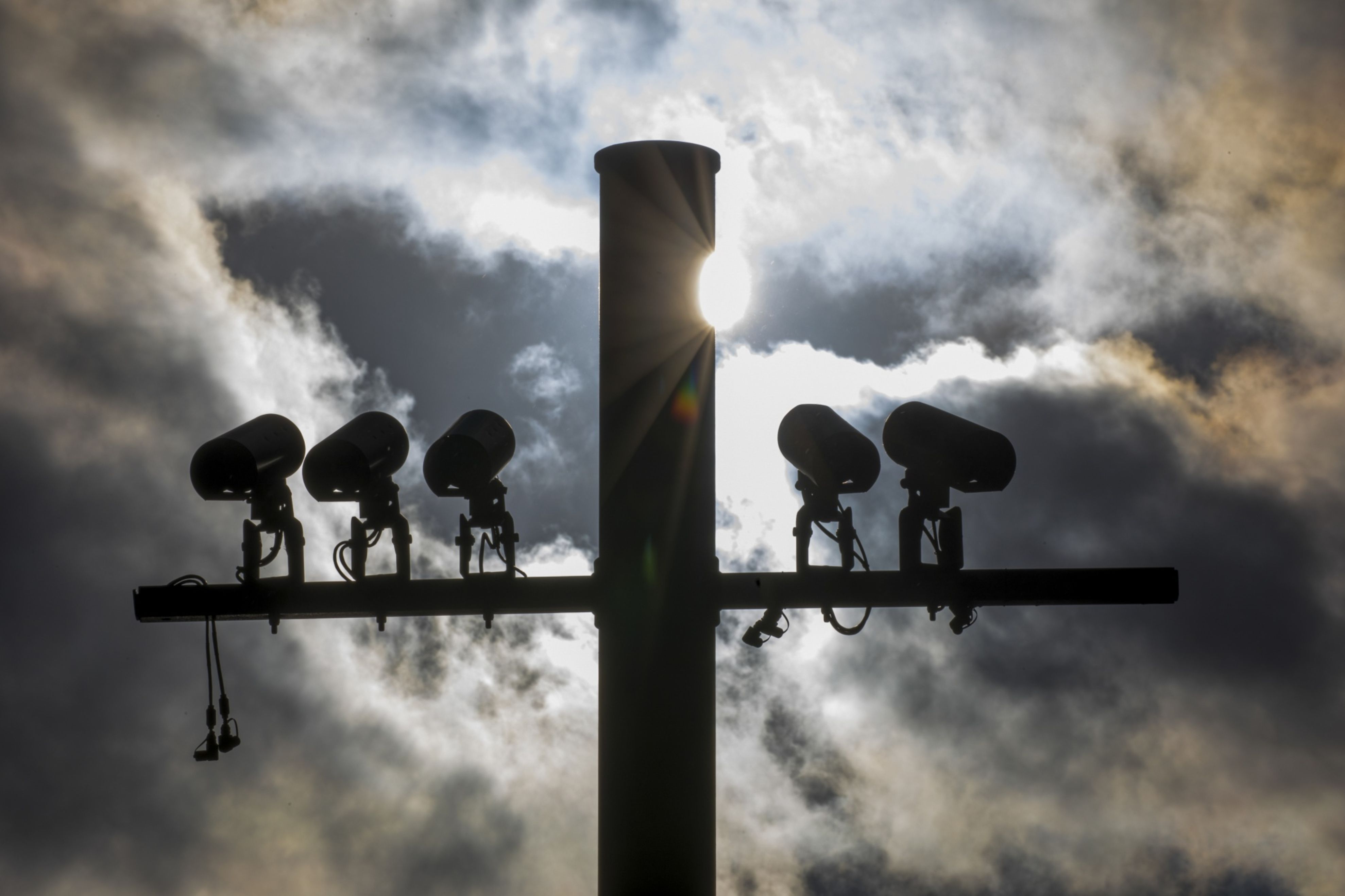 Security surveillance cameras CCTV sit on a pole in London. (U.K. Photographer: Jason Alden/Bloomberg)