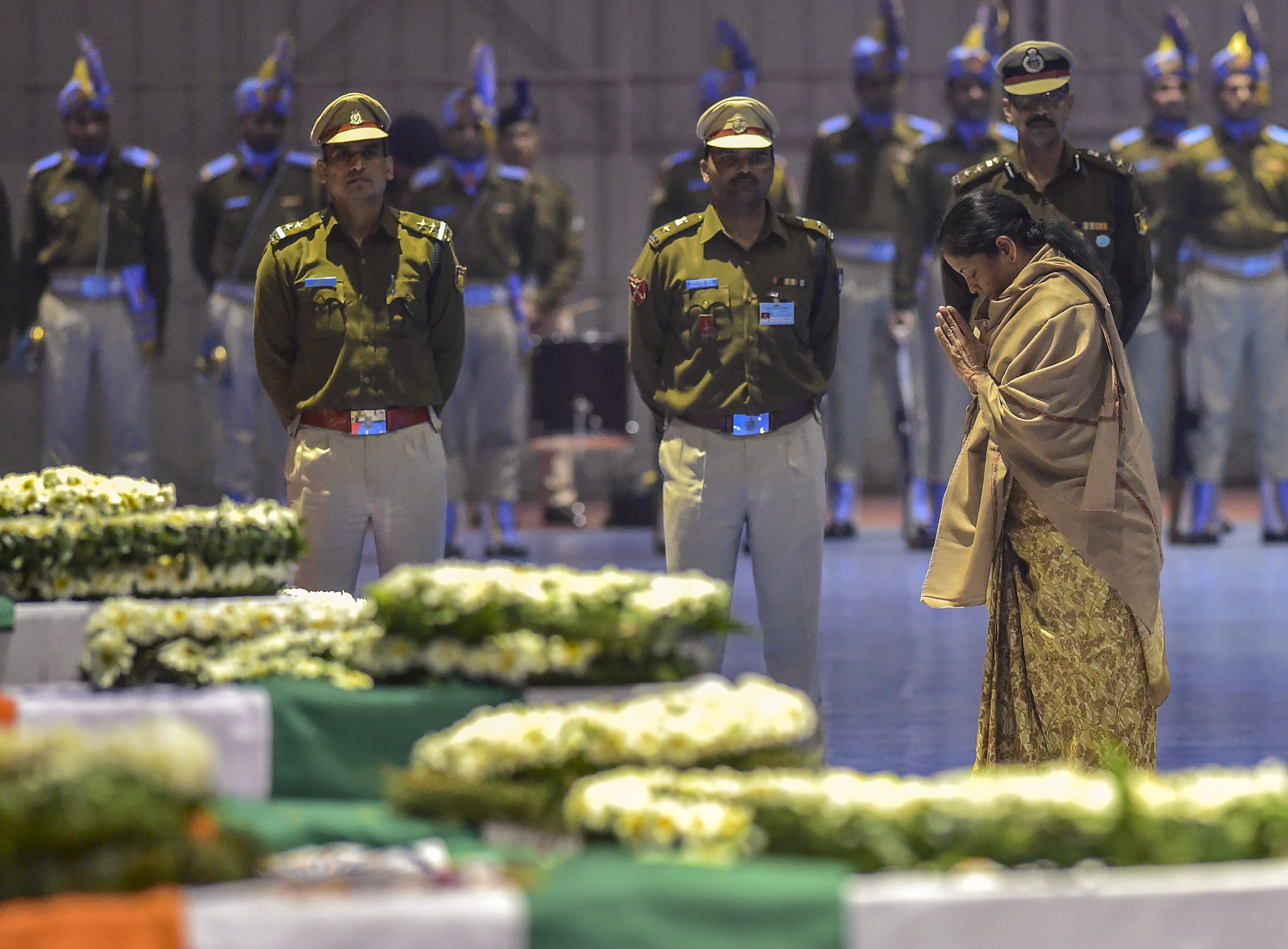 Union Minister Rajyavardhan Singh Rathore pays last respects to Pulwama martyrs.