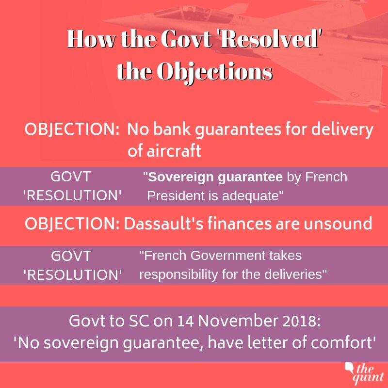 (New information has been published in The Caravan detailing the objections from the Law Ministry to the Rafale deal as well as the involvement of NSA Ajit Doval in recommending foregoing a sovereign guarantee from France. In light of this, The Quint is republishing this article, originally published on 16 November 2018, about how two objections to the deal from the Indian Negotiating Team had been ‘resolved' by the government purely on the basis of a sovereign guarantee, which the government seemingly never intended to secure in the first place.)