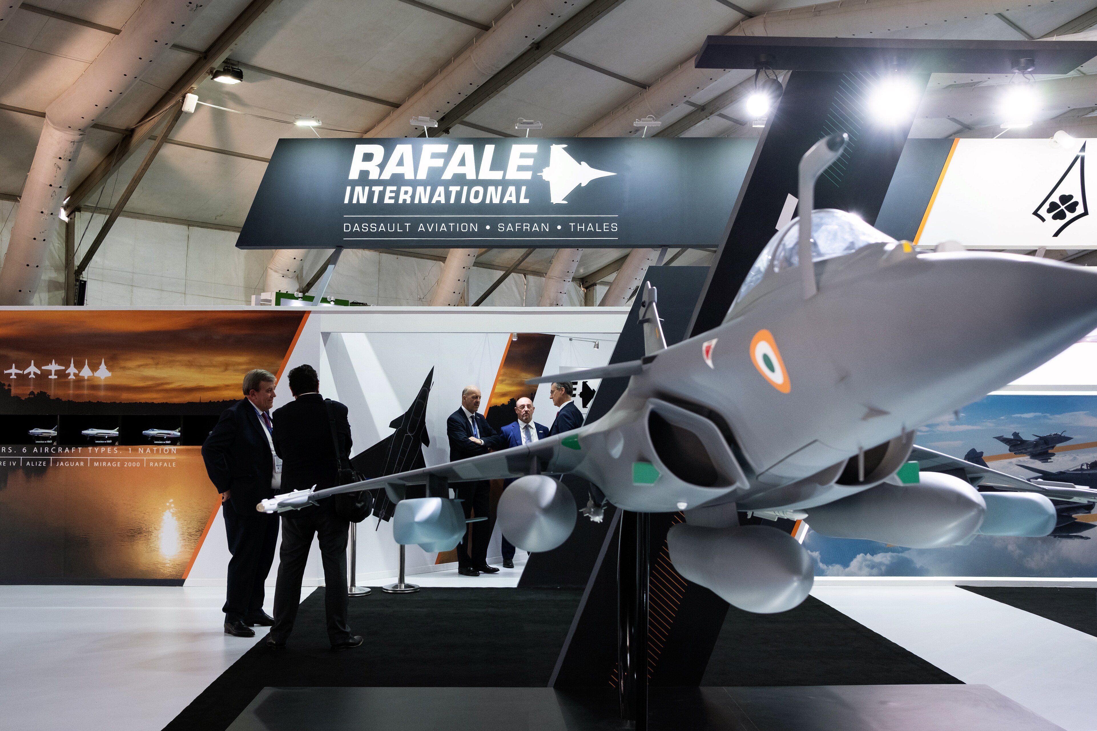 Visitors gather at the booth of Rafale International, consisting of Dassault Aviation SA, Safran SA and Thales SA, at the Aero India air show at Air Force Station Yelahanka in Bengaluru, India. (Photographer: Karen Dias/Bloomberg)