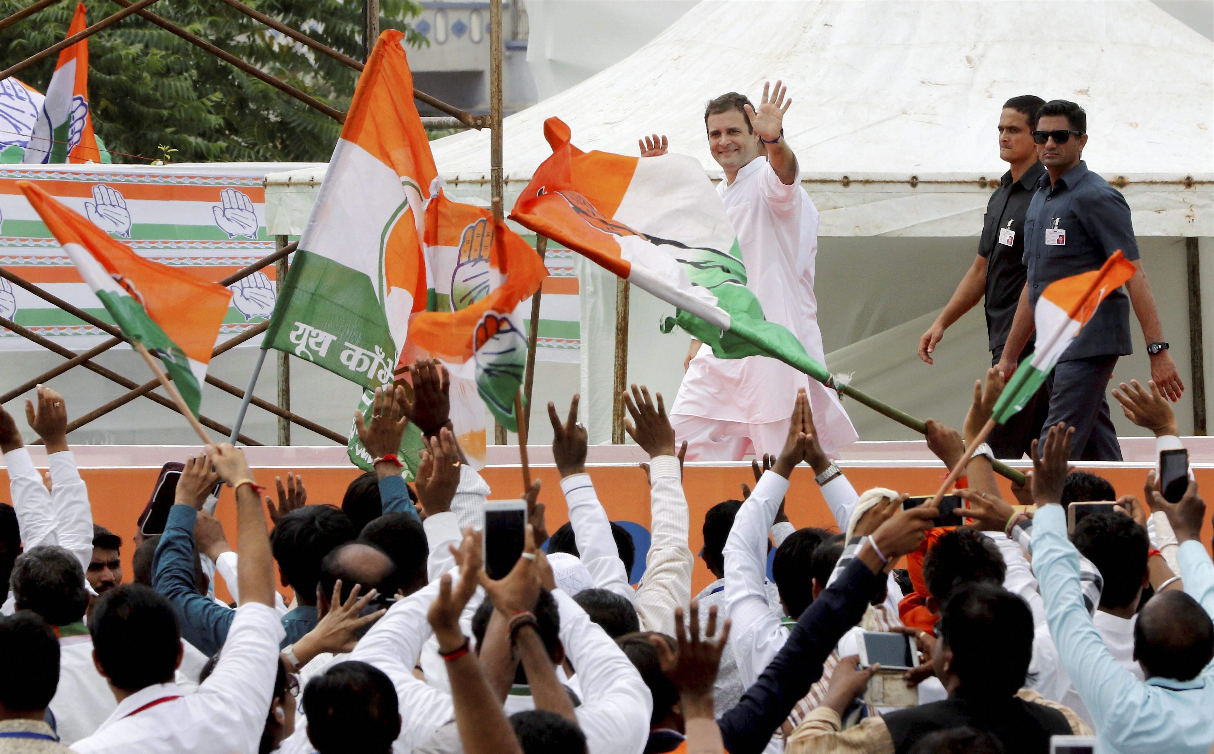 Congress vice-president Rahul Gandhi waves during a “direct dialogue” or Samvad programme program with the supporters of the party in Ahmedabad. (Source: PTI)