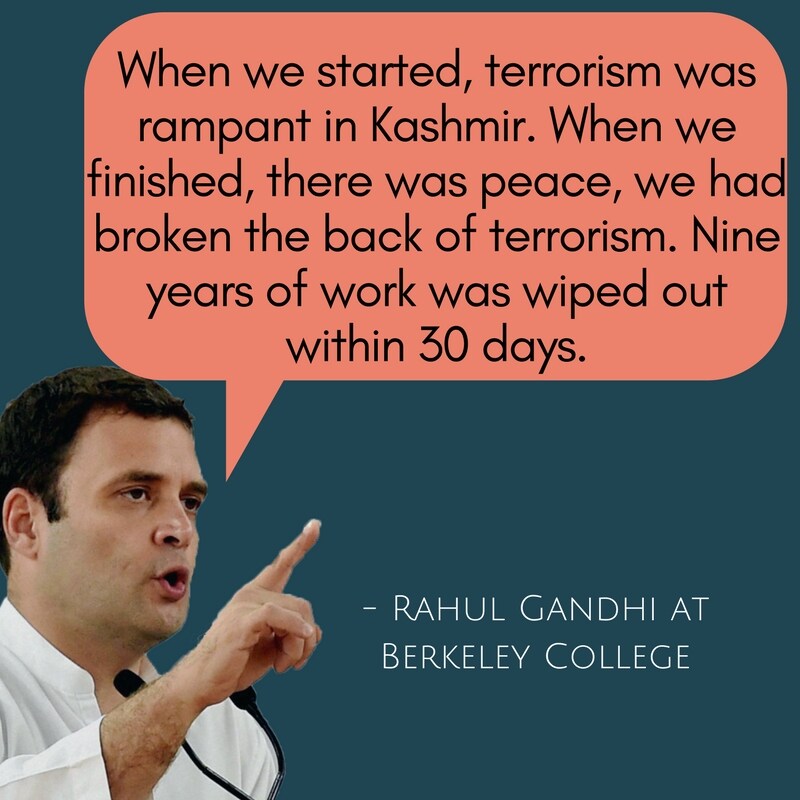 When we started, terrorism was rampant in Kashmir. When we finished, there was peace, we had broken the back of terrorism...In 2014, the government did something that inflicted a huge strategic cost...The day Prime Minister Modi made an alliance with the PDP (People's Democrat, he destroyed it as an instruemt which to could bring these youngsters into the political system. He (PM Modi) massively opened up space for the terrorists in Kashmir, and you saw the increase in violence.