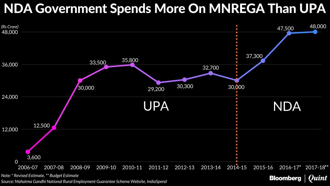 The ruling NDA government has increased the budgetary allocation and actual spending to the world's biggest employment scheme since 2015, with spending peaking at Rs 47,500 crore in 2016-17.