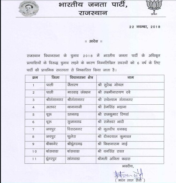 The leaders against whom the action were taken include former Union minister Mahadev Singh khandela, ex-legislators Sanyam Lodha, Nathu Ram Sinodiya, Naval Kishore Meena, Khushveer Singh, Sohan Nayak, C S Baid, Ramesh Chand Khandelwal and Ramesh Khinchi.