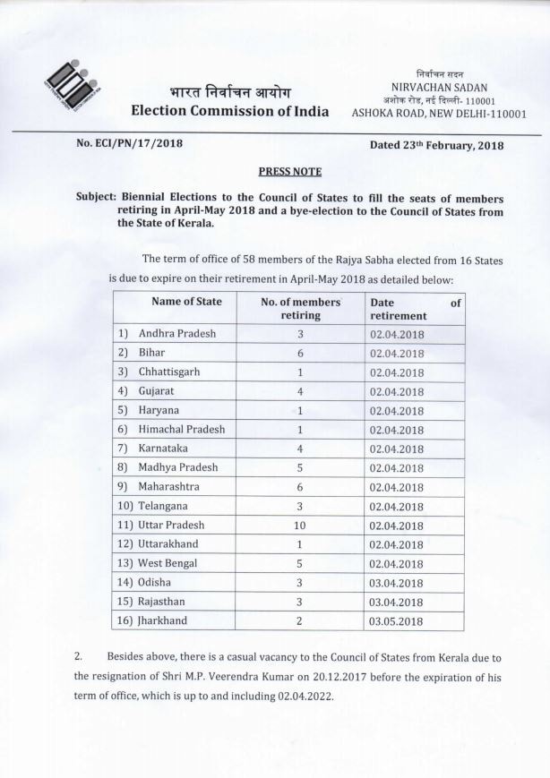 The term of the office of 58 members of the Rajya Sabha from 16 states is due to expire on their retirement in April-May 2018. Apart from these vacancies, an additional vacancy in Kerala needs to be filled.