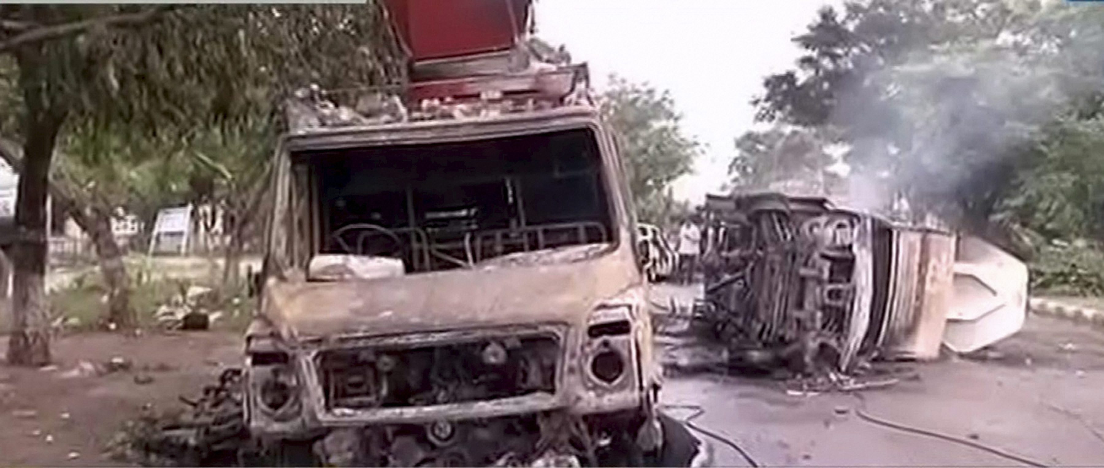 At least three OB vans of private television channels were damaged here. Two vans were overturned by a mob.