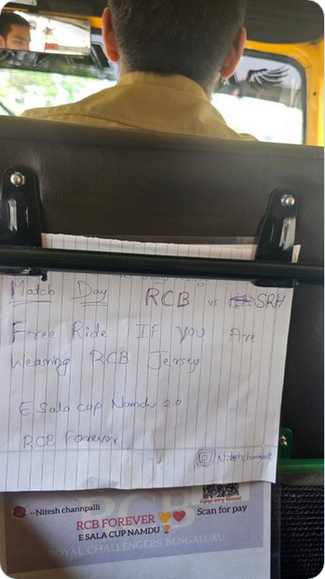 The image showed the back of the driver's seat in an auto with a simple taped note announcing the offer for RCB fans. The note read, "Free ride if you're wearing RCB Jersey."