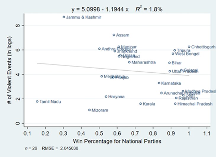 We also investigated if the level of violence depended on whether the regional party was solely responsible for governing the state or was only a member of a coalition. The violence, we found, was driven entirely by instances where regional parties were part of a governing coalition. This suggested that greater access to executive power may be a means of appeasing the violent groups associated with these regional political parties.