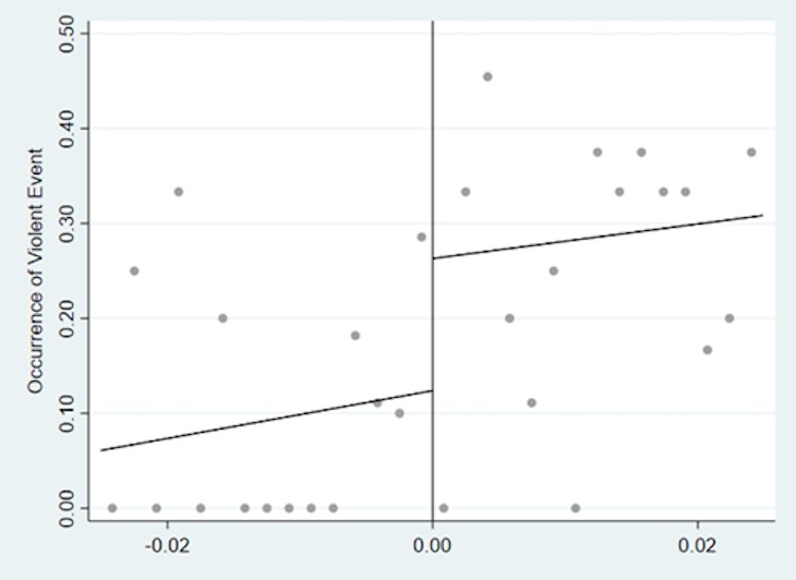 Figure 2 plots the average occurrence of violence against the margin of victory or defeat for a regional political party candidate. To the right of the vertical line at 0 are cases where a regional party candidate won the assembly seat. To the left, those where a regional party candidate lost. The figure shows that average occurrence of a violent event increases when the local Member of Legislative Assembly belongs to a regional political party.