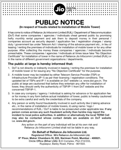 “Since the Reliance Jio users are struggling with data speed and network problem of Reliance Jio, the company Reliance Jio Infocomm Limited has decided to install more than 6,000 North Infratel across the country and shall shortly issue the detailed official guidelines to install Jio tower in your Plot, Roof top, Field, Market etc, places (sic),” reads one of the websites.