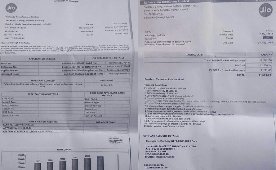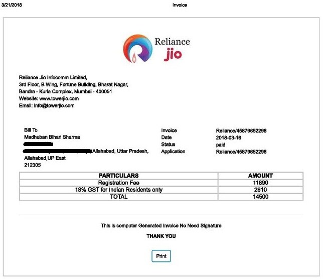 Sharma said that he had also received an invoice of his payment on a Reliance Jio letterhead, which he provided a copy of.