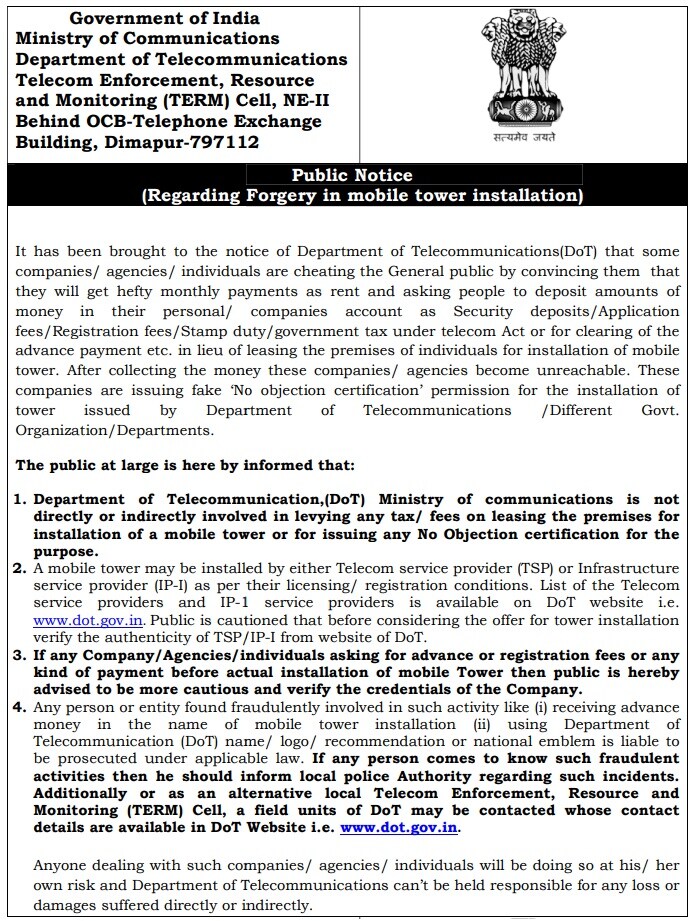 The Department of Telecommunications (DoT) had issued a public notice regarding the forgery in mobile tower installation.