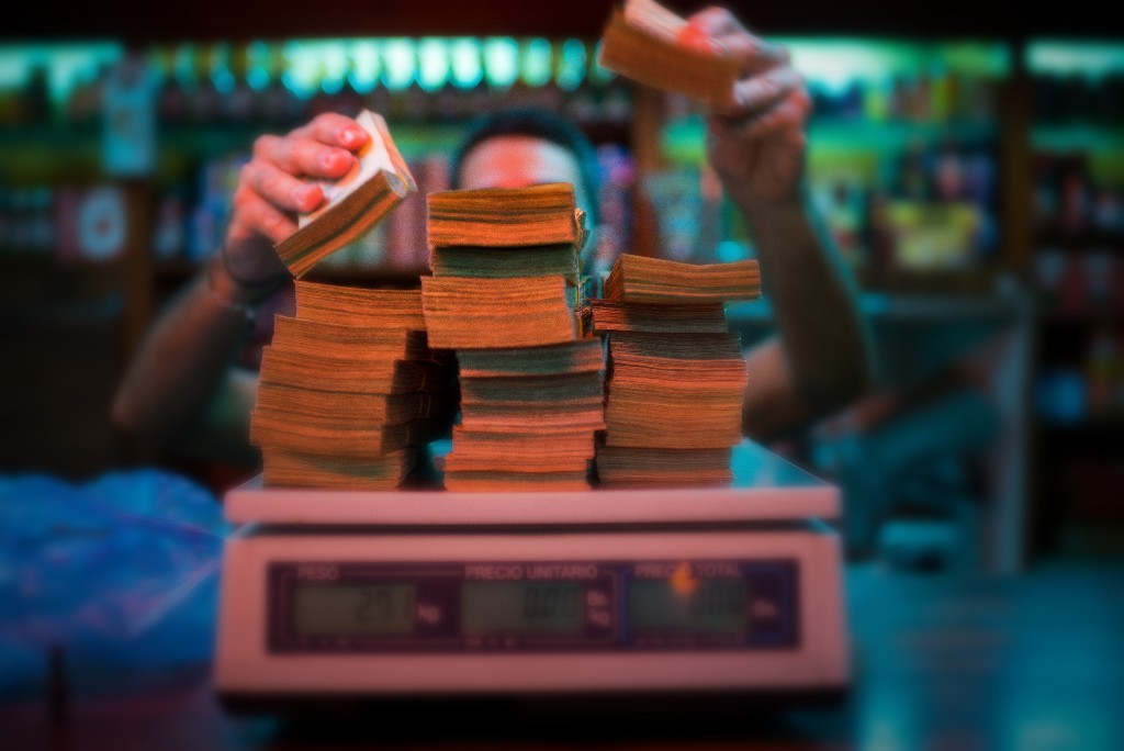 A man weighing piles of cash. (Photographer: Manaure Quintero/Bloomberg)