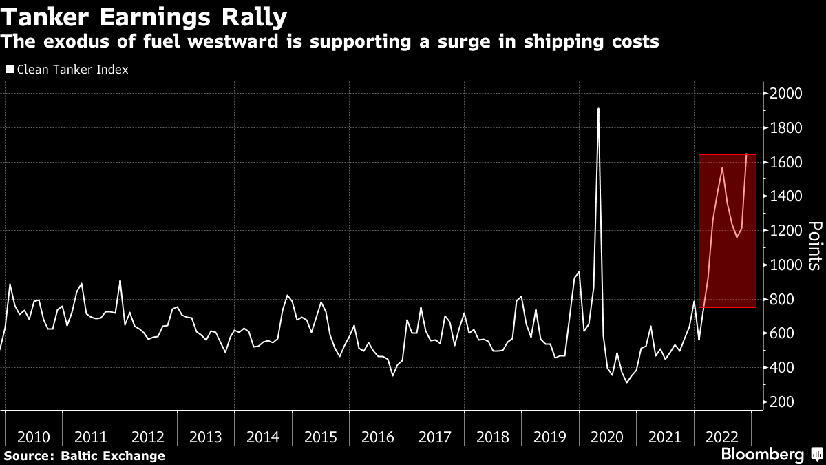 The hauling of petroleum products westward across longer distances is sharply boosting shipping costs and driving a rally in tanker earnings. The volume of fuel transported by sea is 3% higher than averages seen in the last five years, according to Vortexa Ltd. data. That's led by diesel from Asia and the Middle East to Europe, and volumes may expand as the latter bans Russian supplies, said Serena Huang, lead Asia analyst for Vortexa.
