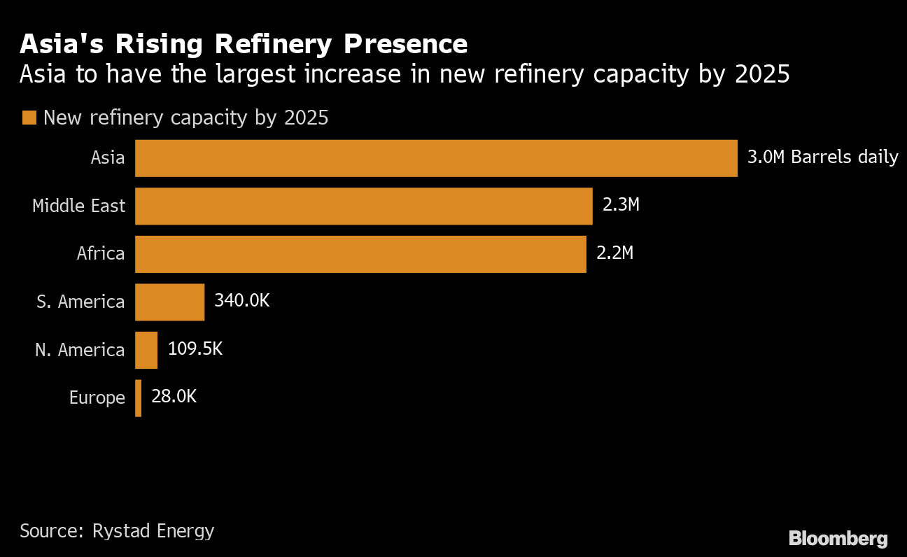 That gap is expected to widen. About 8 million barrels a day of new refining capacity is set to come online in the next three years, with Asia adding the most and Europe the least, according to estimates by Rystad Energy.