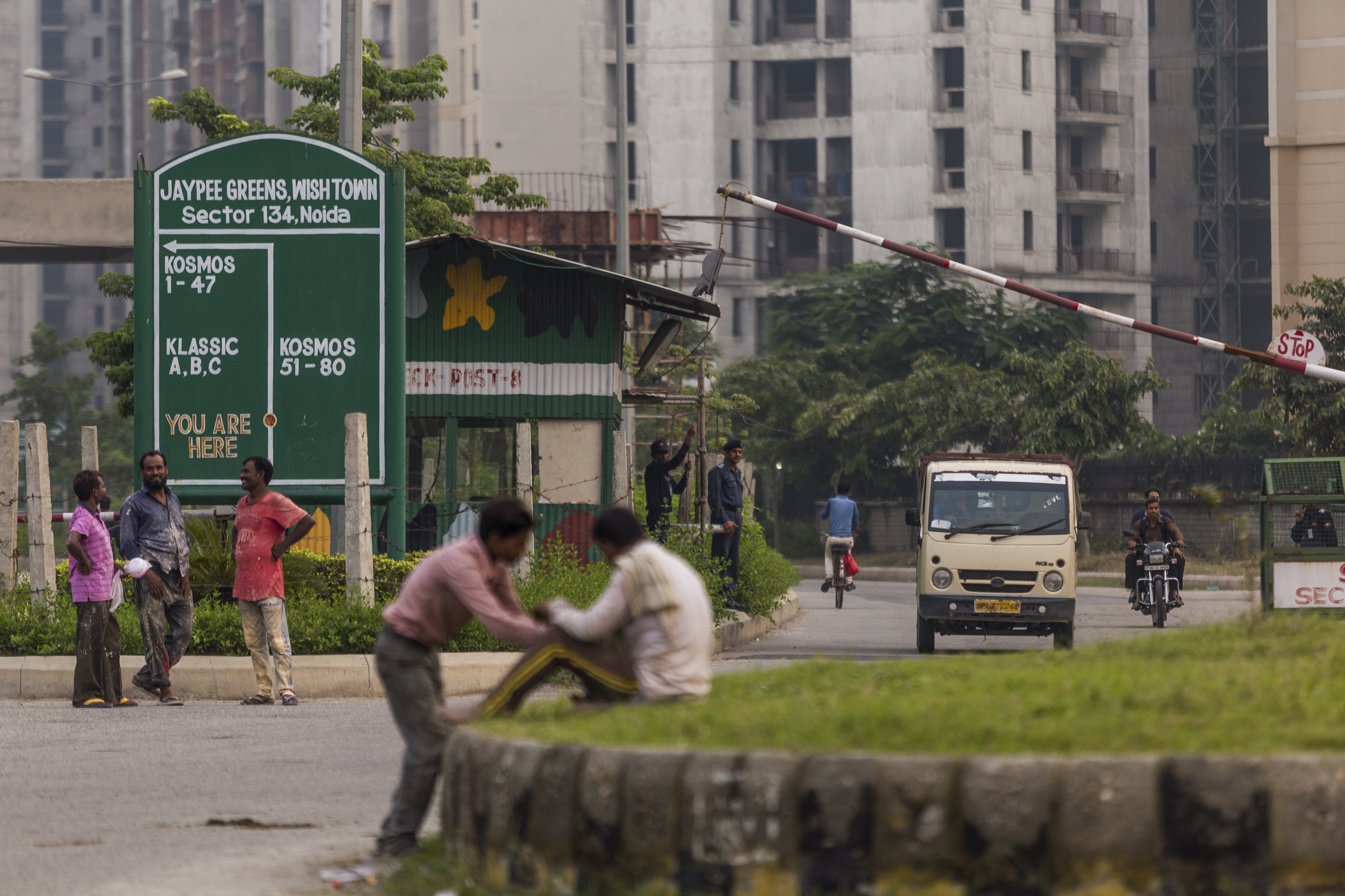 Laborers stand outside the Jaypee Wish Town Project, developed by Jaypee Infratech Ltd., in Noida. (Photographer: Prashanth Vishwanathan/Bloomberg)