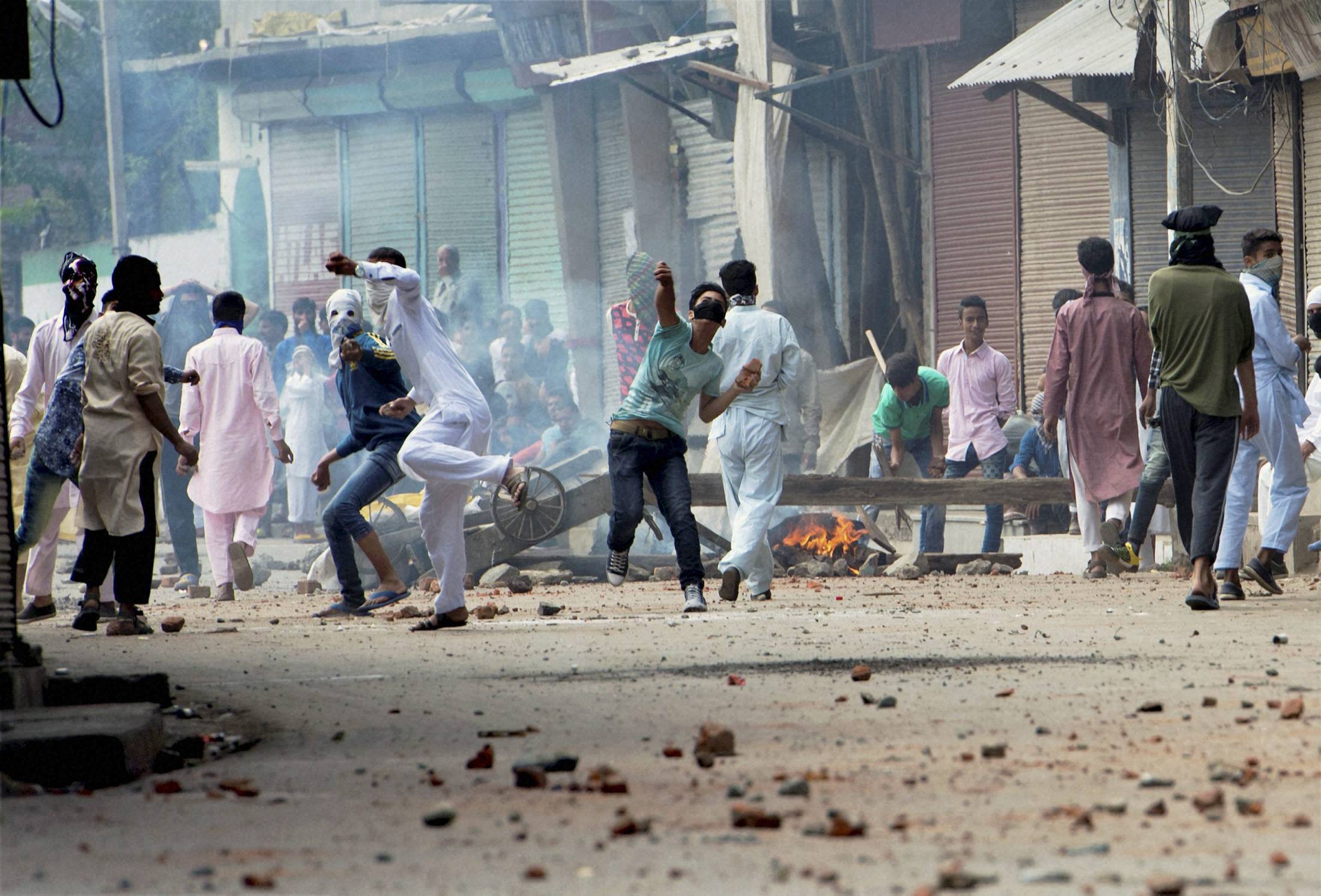 Youths pelting stones at security forces personnel during a clash after they defied curfew in Srinagar (Photographer: S Irfan/PTI)