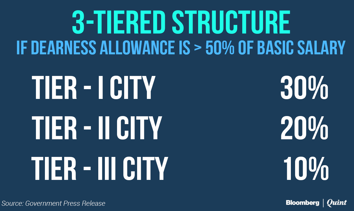 As of now, the existing rates of HRA for Tier I, II and III cities and towns are 30 percent, 20 percent and 10 percent of an employee's basic pay.