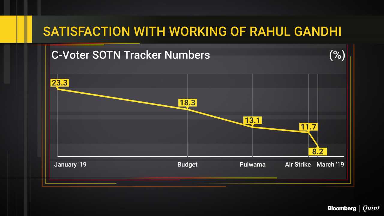 Congress President Rahul Gandhi seems to have lost the momentum gained after wins in three Hindi heartland states of Madhya Pradesh, Chhattisgarh and Rajasthan. His drop in popularity from 23 percent the start of the year to 8 percent by the first week of March is consistent with Modi's rise, according to C-Voter's ‘State of the Nation' poll.