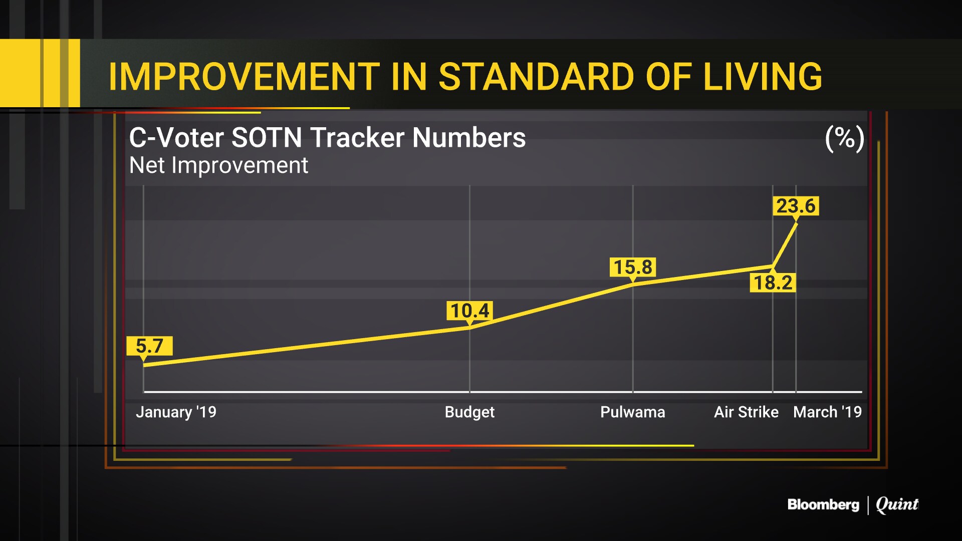 Budget in February helped improve the way voters perceive the incumbent government. While those who believed their standard of living had improved jumped up from nearly 6 percent to 23 percent, net optimism about India improved from about 15 percent to nearly 41 percent. This is despite no significant possibility of change in standards of living in just 10 weeks. Yashwant Deshmukh, managing direct at C-Voter, puts it down to sops for farmers and the middle class in the budget.