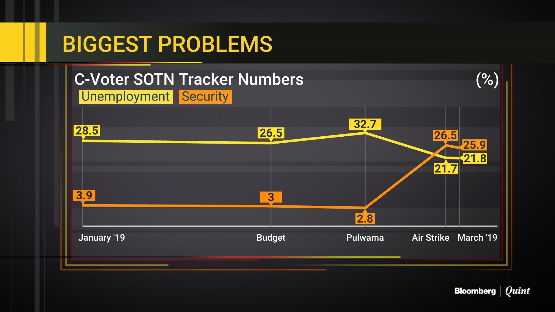 The most telling data point from the C-Voter survey is the question on most important problems facing that respondent face. While 28.5 percent said unemployment was the biggest problem on Jan. 1, the number dropped marginally to 21.8 percent by March 7. But national security, which was chosen as a key issue by just 4 percent jumped to 26 percent, becoming the biggest issue.