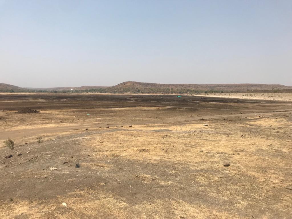 The bed of the Bodhegaon reservoir looks like a playground as the region battles its third drought in five years. The road to the reservoir is lined with tractors waiting to cart the silt away.