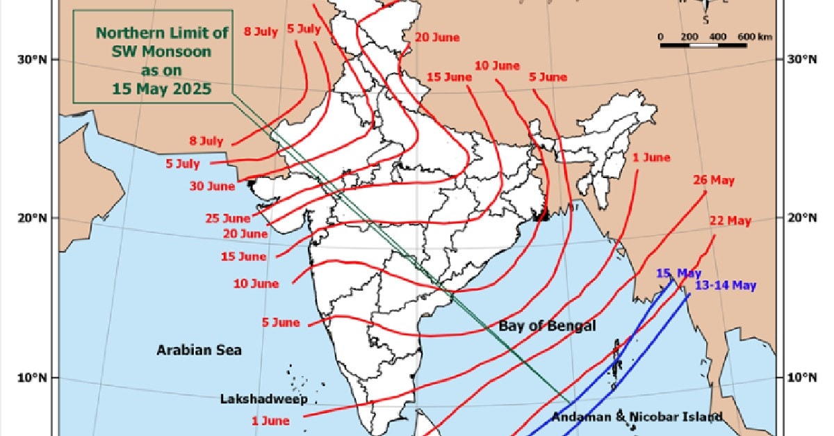 The Southwest Monsoon has advanced further today, May 15, said the India Meteorological Department (IMD). It has now reached parts of the southeast Arabian Sea, the Maldives, the Comorin area, the South Bay of Bengal, the Andaman Islands, and the Andaman Sea.