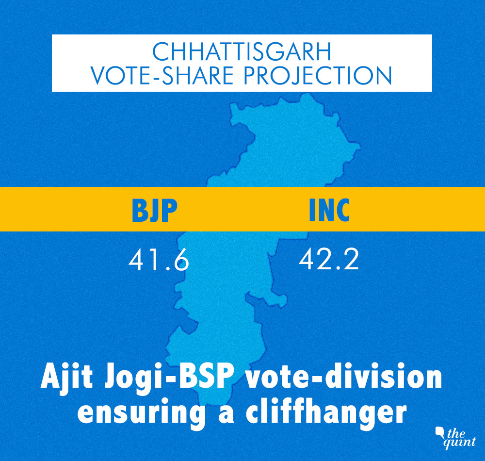 Therefore, it is safe to say that BJP may tilt the scales ever so slightly in its favour to squeeze a narrow win, given the moribund leadership of the state Congress, and Ajit Jogi's vote-splitting cameo with Mayawati's BSP.