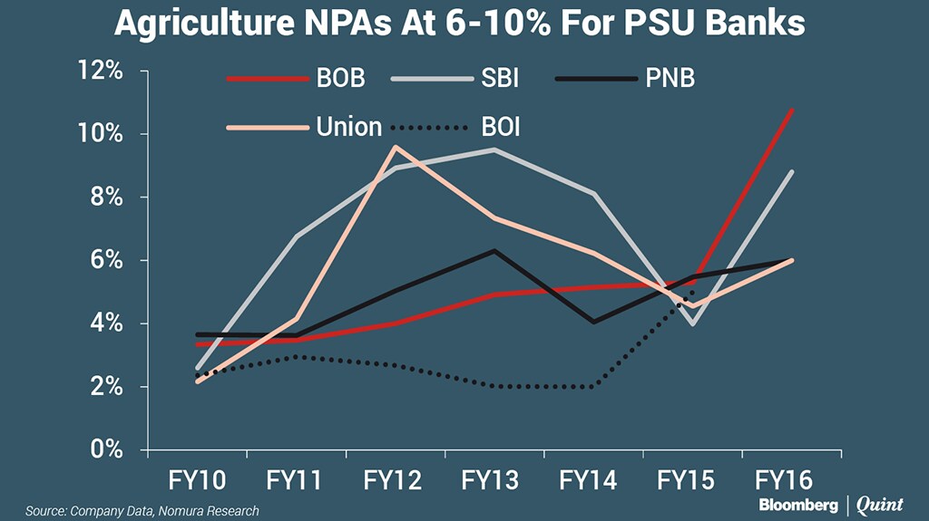Public sector banks and rural banks together hold more than 85 percent of the total agricultural debt of India. Their exposure to unsecured loans may be more than 85 percent, said Nomura.