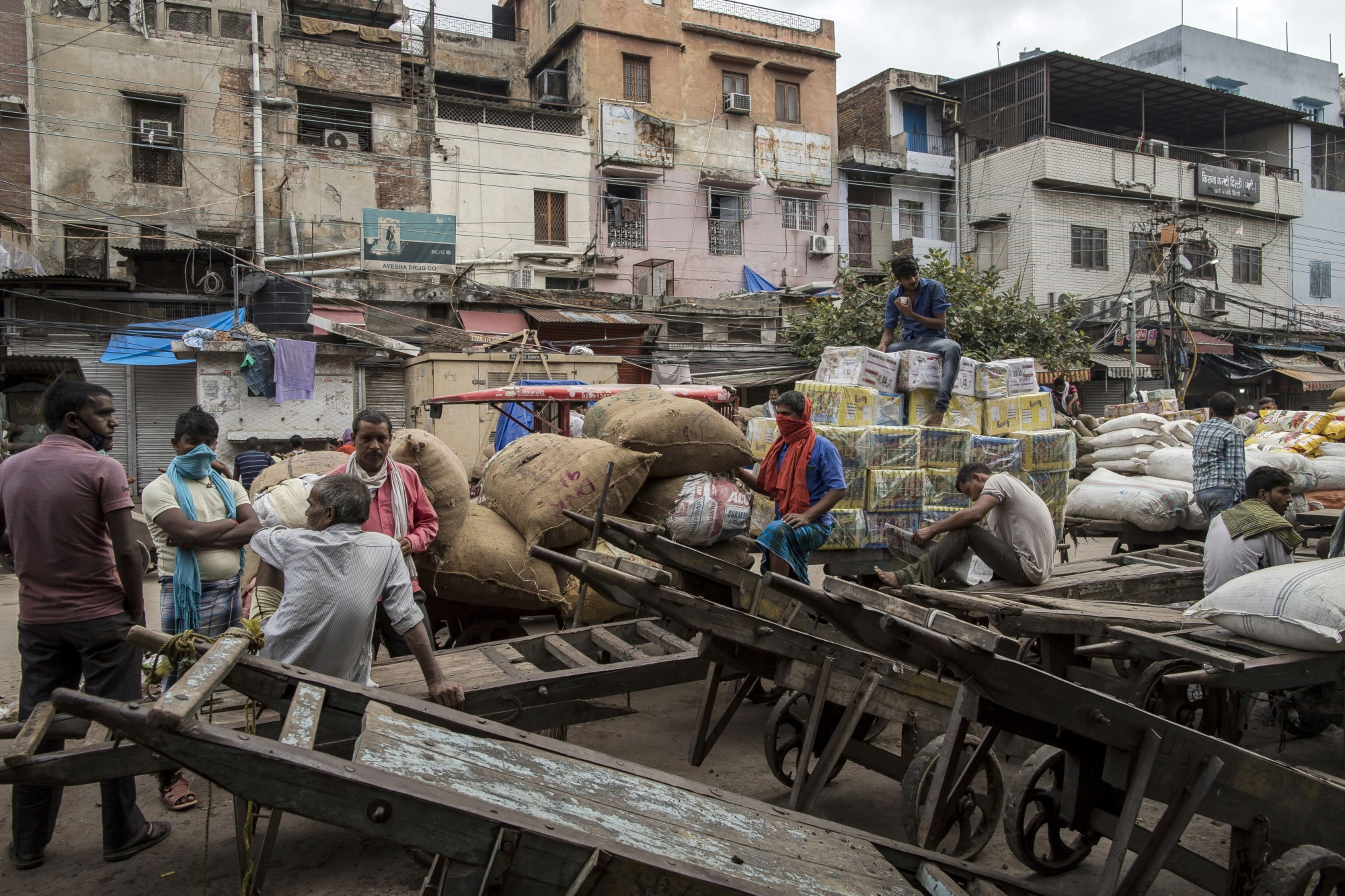 Workers and day laborers gather with carts outside shuttered stores in New Delhi. (Photographer: Anindito Mukherjee/Bloomberg)