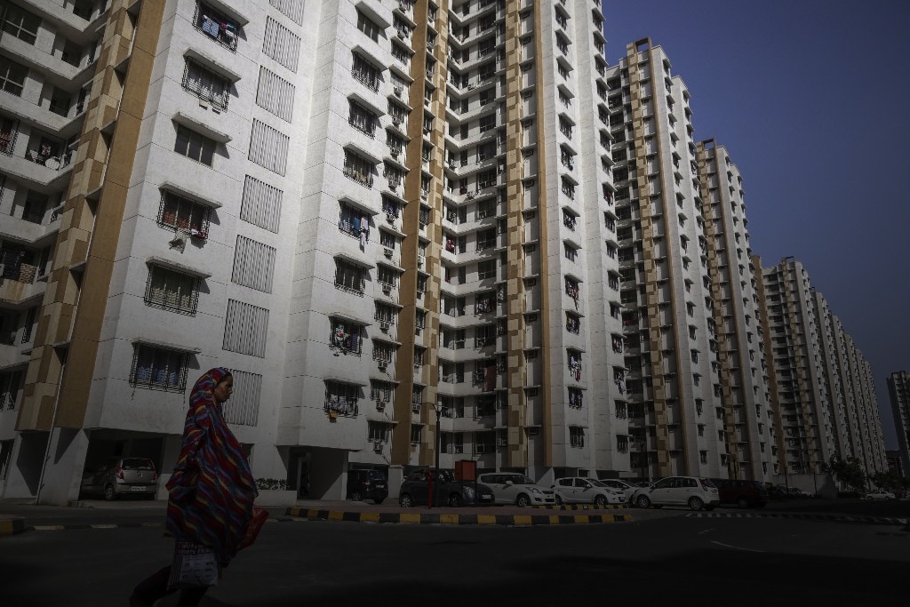 A pedestrian walks in front of residential apartment buildings in Palava City on the outskirts of Mumbai.