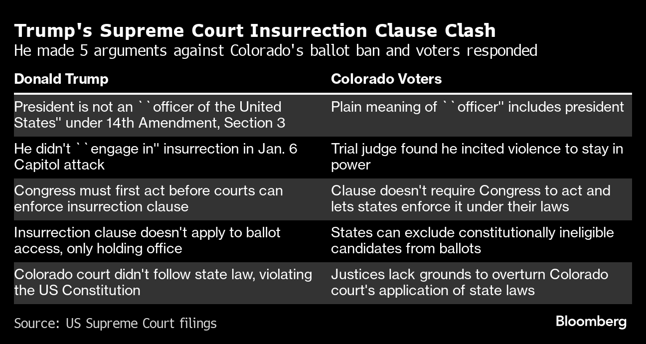 Trump is seeking a broad ruling that would end the push around the country to kick him off state ballots. The high court for the first time is interpreting the 14th Amendment provision that bars people from returning to office if they took an oath to support the Constitution and then engaged in insurrection.