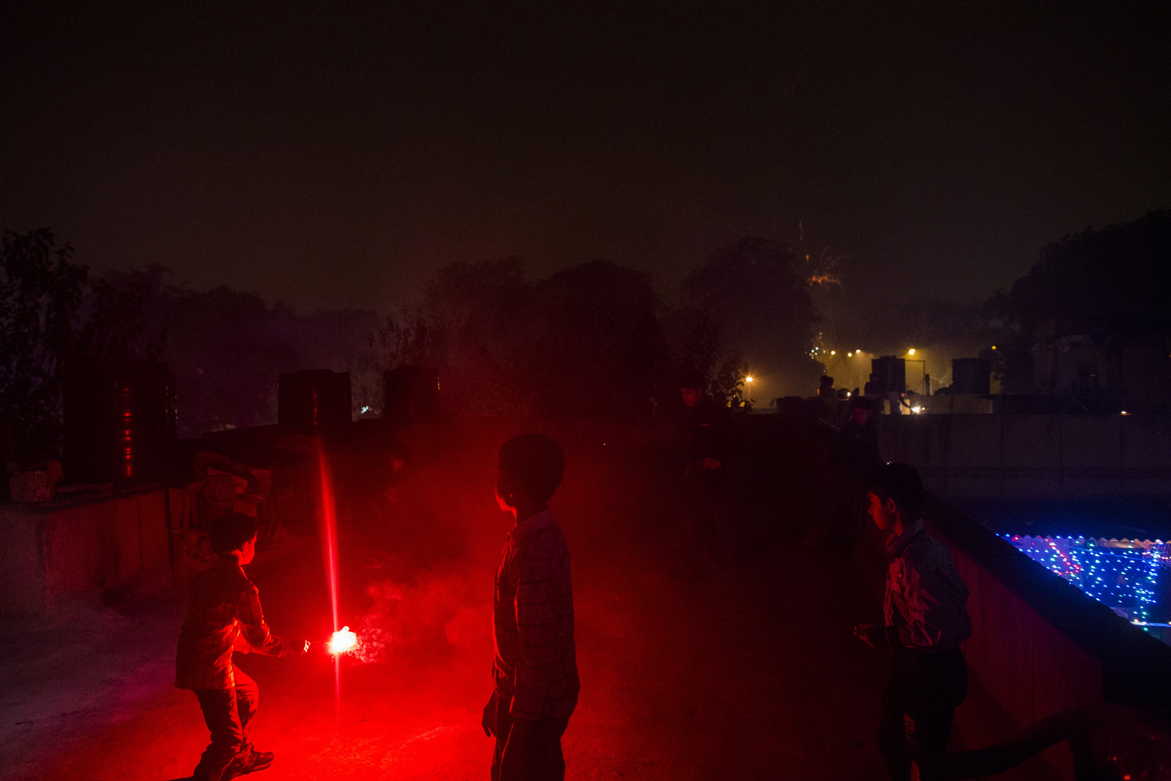 Revelers watch a firework during Diwali celebrations in Delhi, India. (Photographer: Prashanth Vishwanathan/Bloomberg)