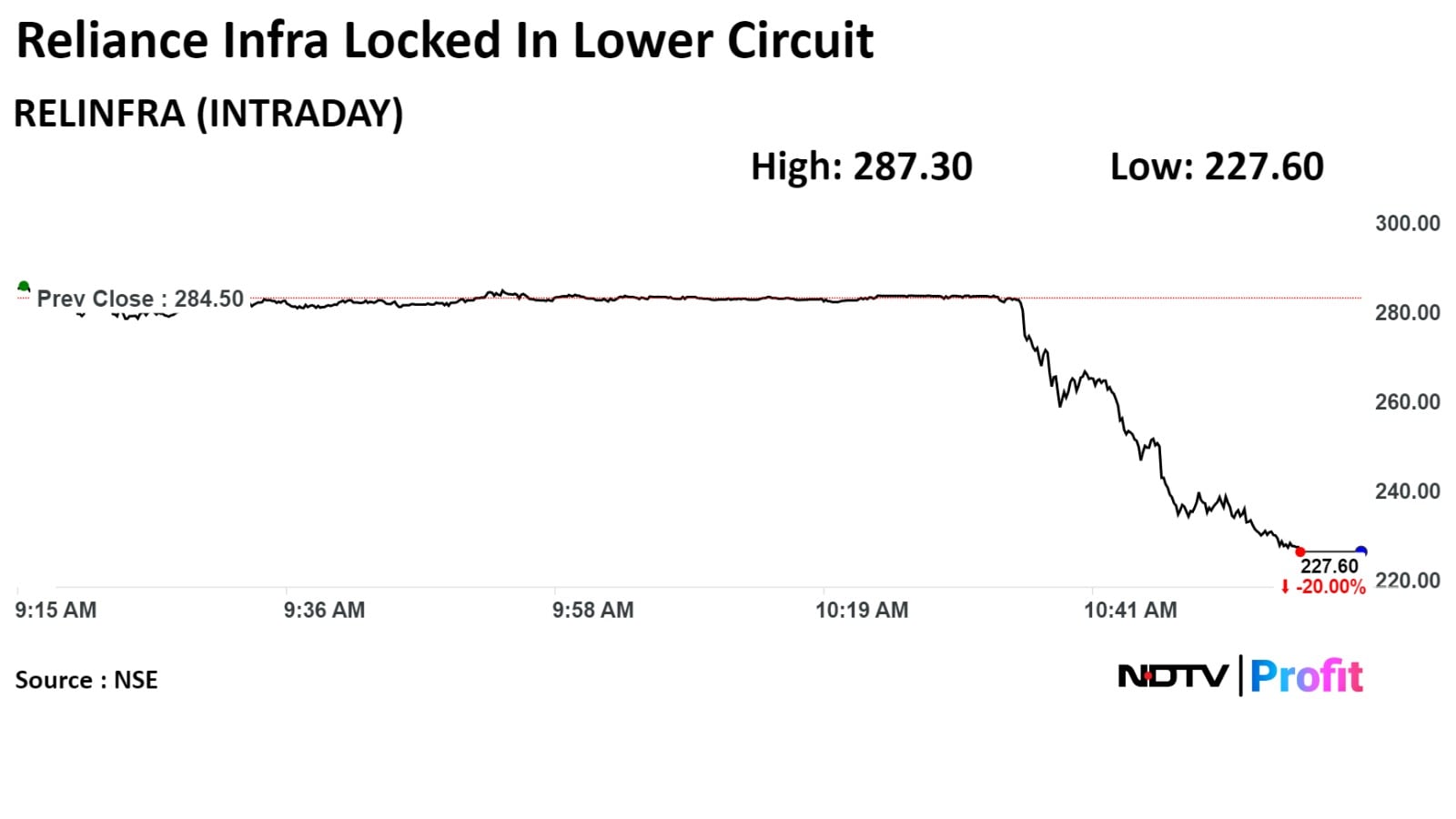 Shares of Reliance Infrastructure tumbled and were locked in 20% lower circuit of Rs Rs 227.60 apiece, the lowest level since March 15. This compares with 0.32% gains in the benchmark BSE Sensex.