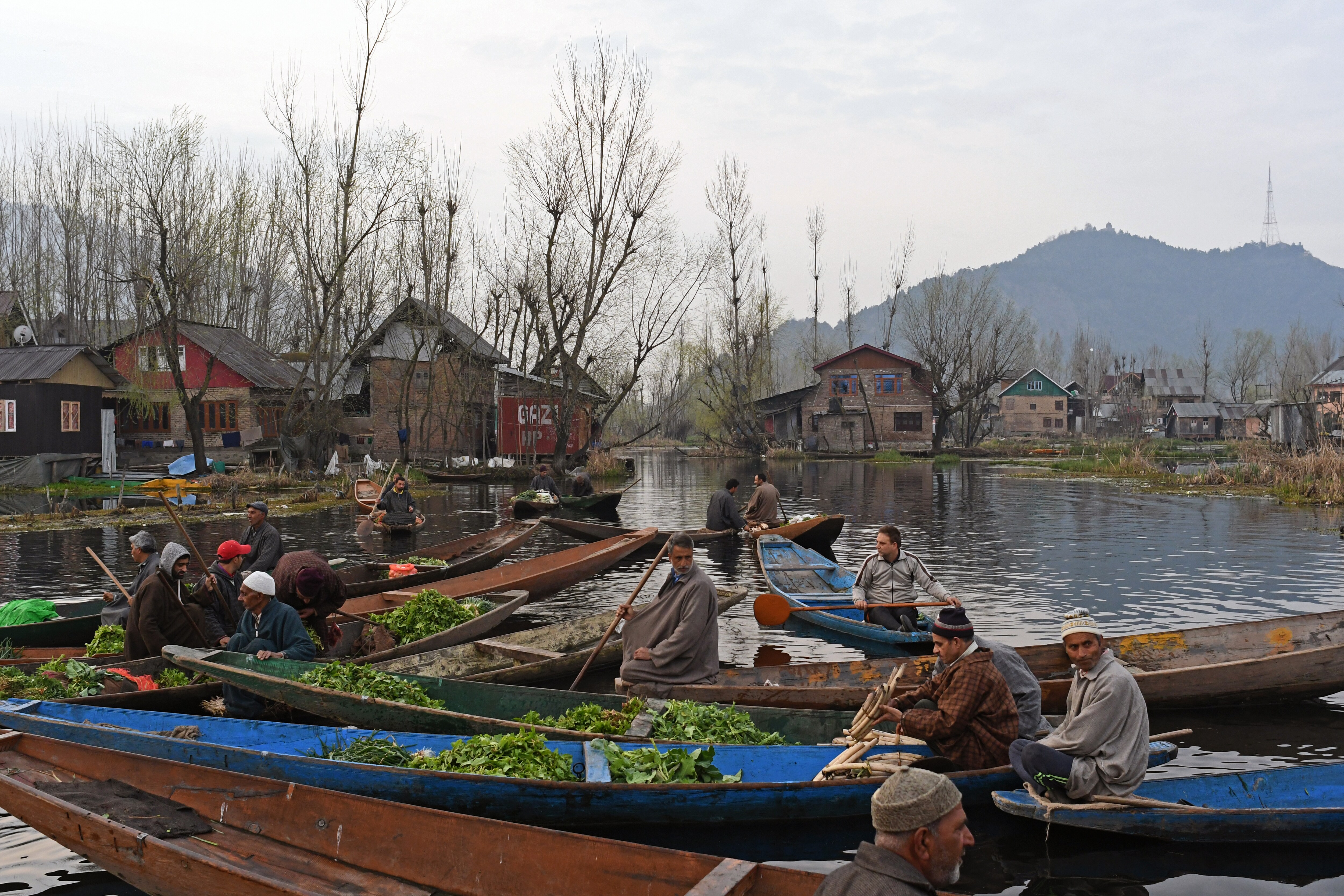 Vegetable vendors sit in boats on Dal Lake in Srinagar, Jammu and Kashmir, India. (Photographer: Anindito Mukherjee/Bloomberg)