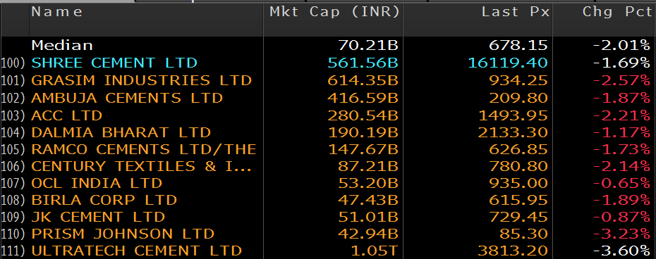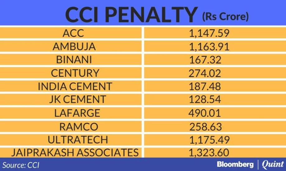 In a separate order, the CCI imposed a penalty of Rs. 397.51 crore on Shree Cement Ltd. Ultratech Cement Ltd. declined the most among cement companies today, falling 3.6 percent to Rs 3,813.20 per share, as of 1:35 p.m.