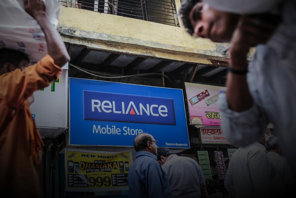 Pedestrians walk past a Reliance Communications Ltd. Mobile Store in Mumbai. (Photographer: Dhiraj Singh/Bloomberg)