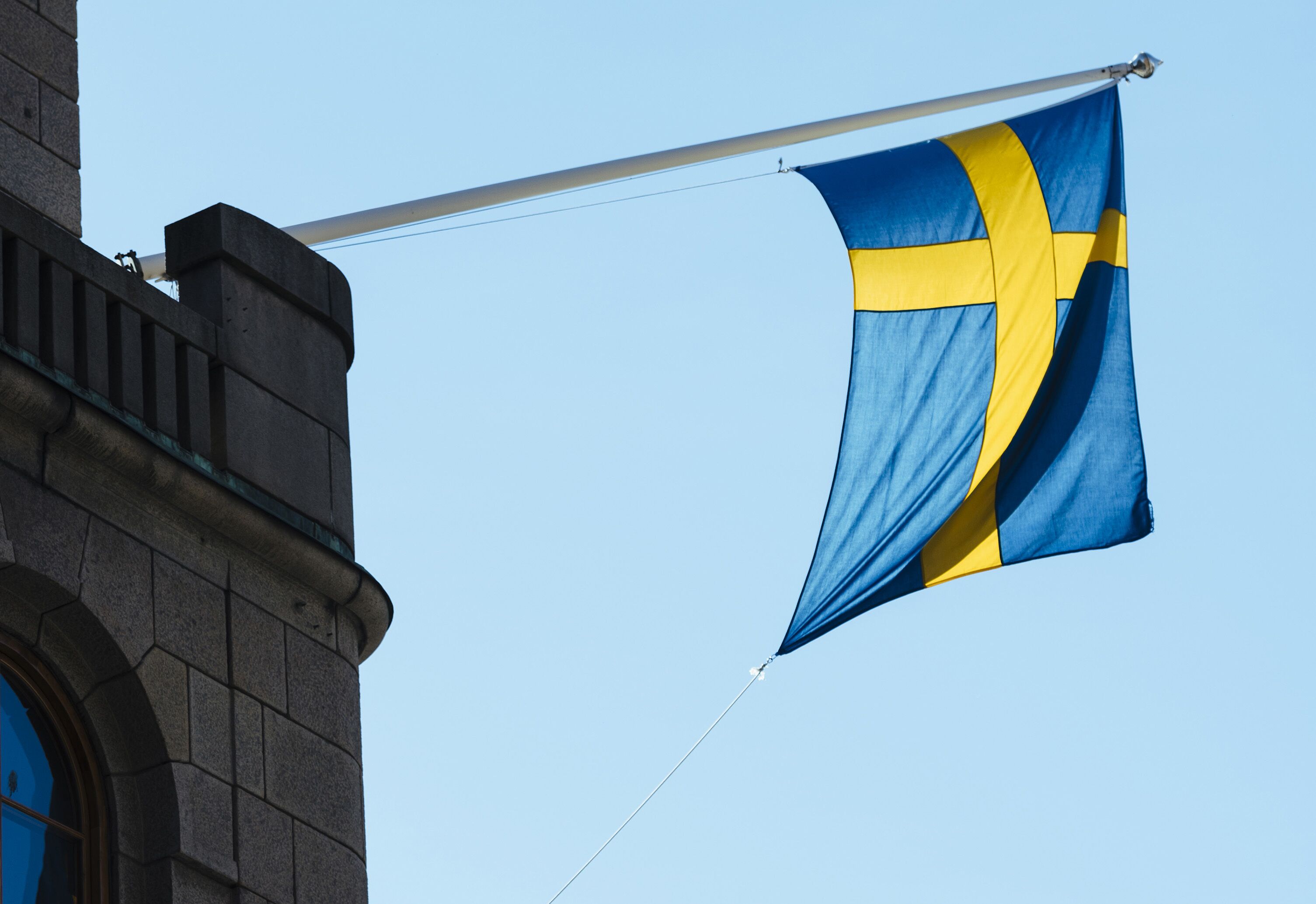 A national flag of Sweden hangs from a commercial building in Stockholm, Sweden. Photographer: Mikael Sjoberg/Bloomberg