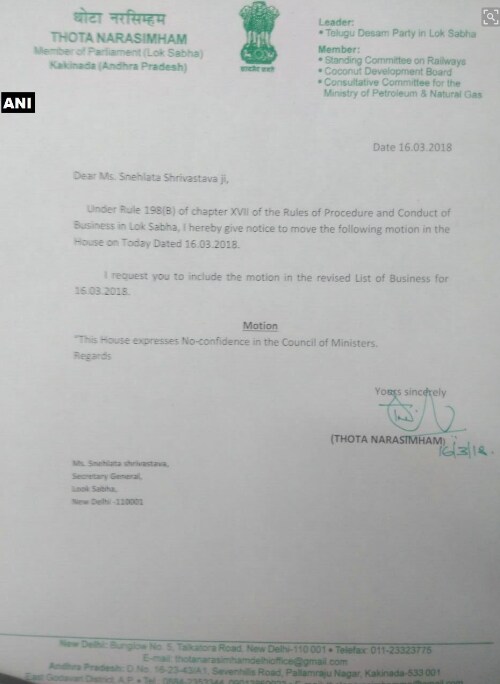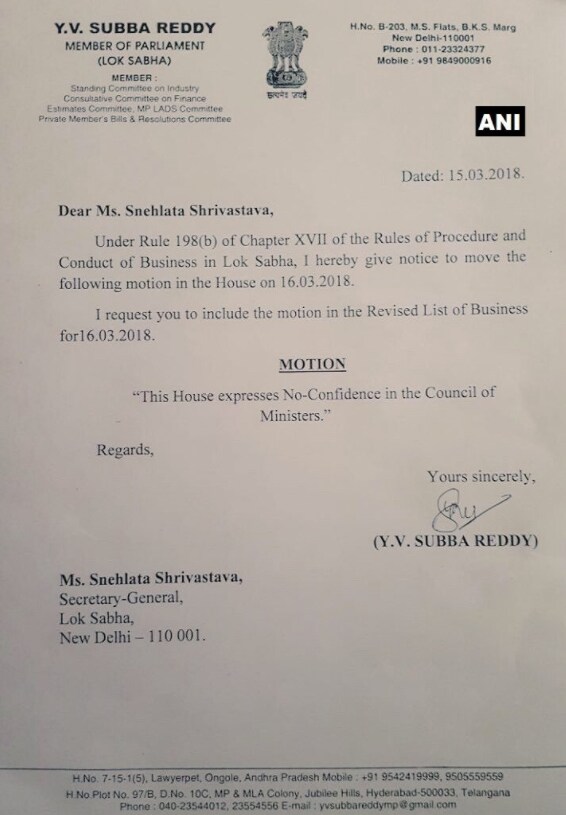 YV Subba Reddy of the YSR Congress has written to the Lok Sabha Secretariat to put his notice for the motion in the revised list of business for Monday. The TDP has also moved a notice for a no-confidence motion.