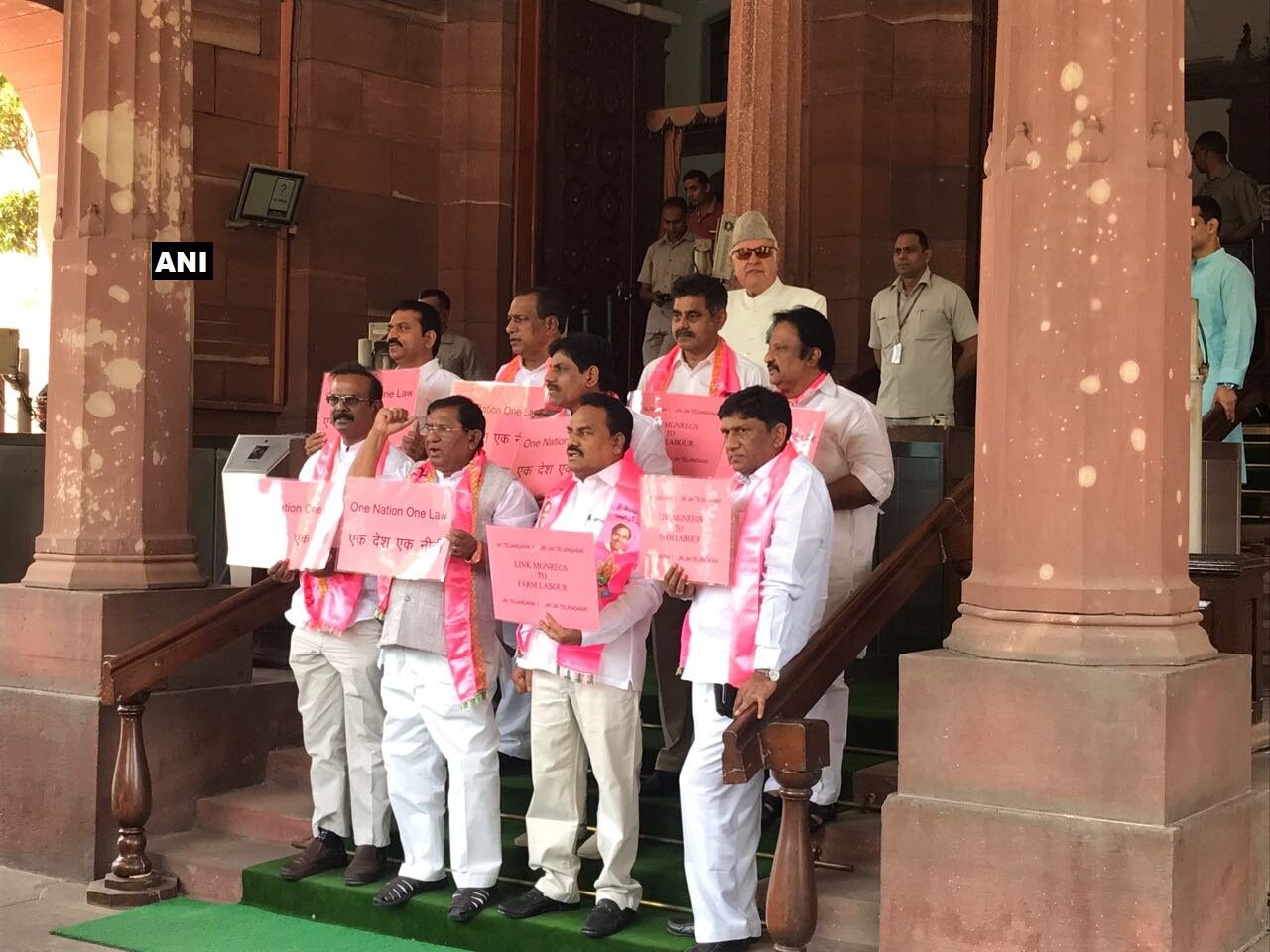 TDP MPs continued their protest over the special status category to Andhra Pradesh outside the Parliament in New Delhi on Monday, 19 March.