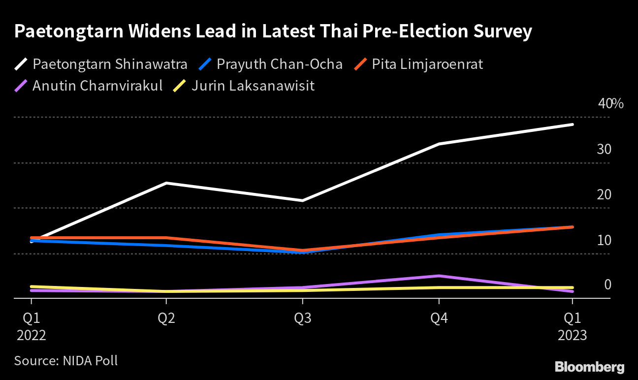 (Bloomberg) -- Thai opposition party leading in opinion surveys officially nominated Paetongtarn Shinawatra, a scion of the Shinawatra family, as one of its three prime minister candidates as widely expected, pitting her against ex-generals seeking to extend a near decade of military-backed rule.
