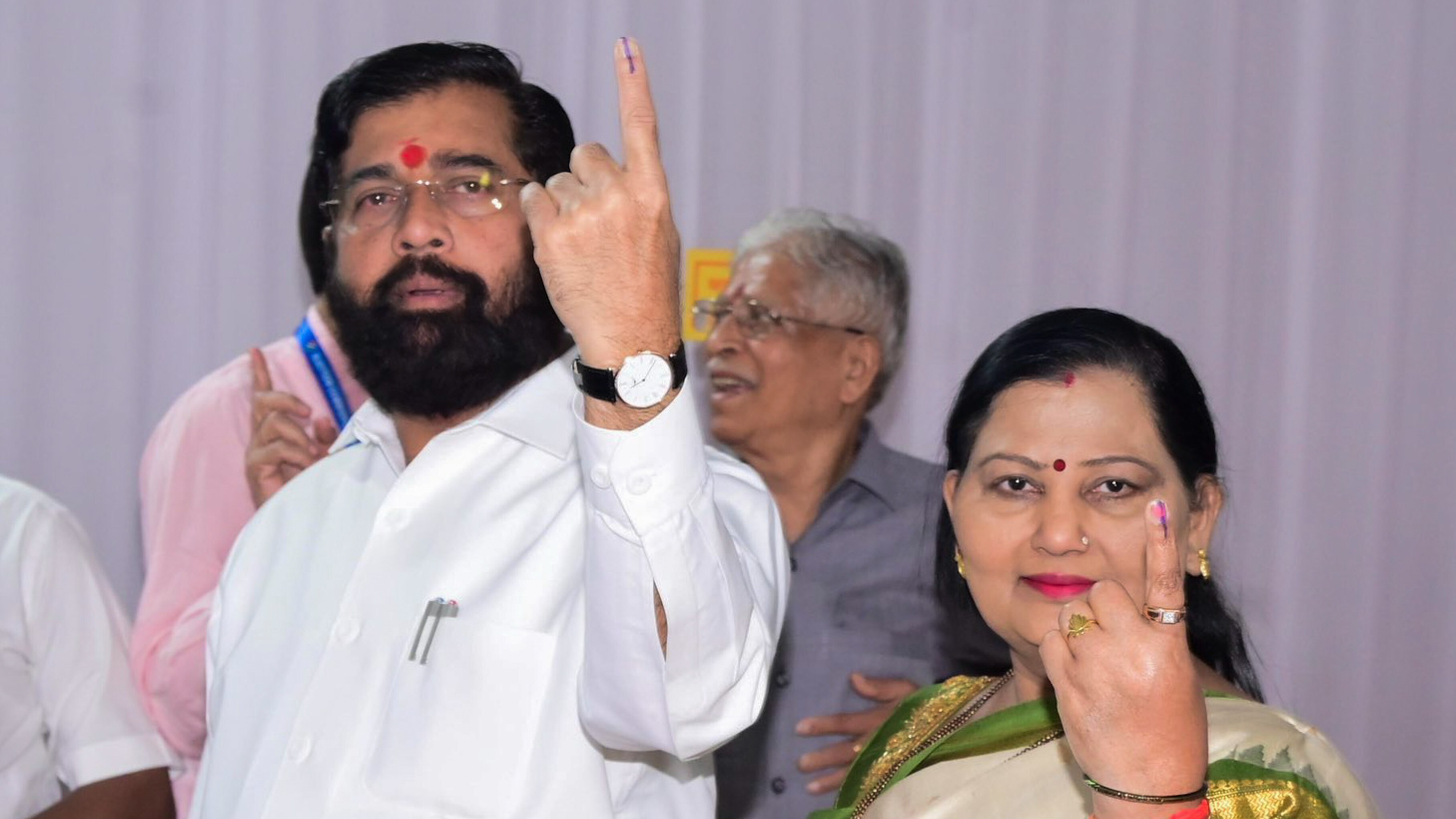 Maharashtra Chief Minister Eknath Shinde and his wife show their ink-marked fingers after casting vote. (Photo source: PTI)