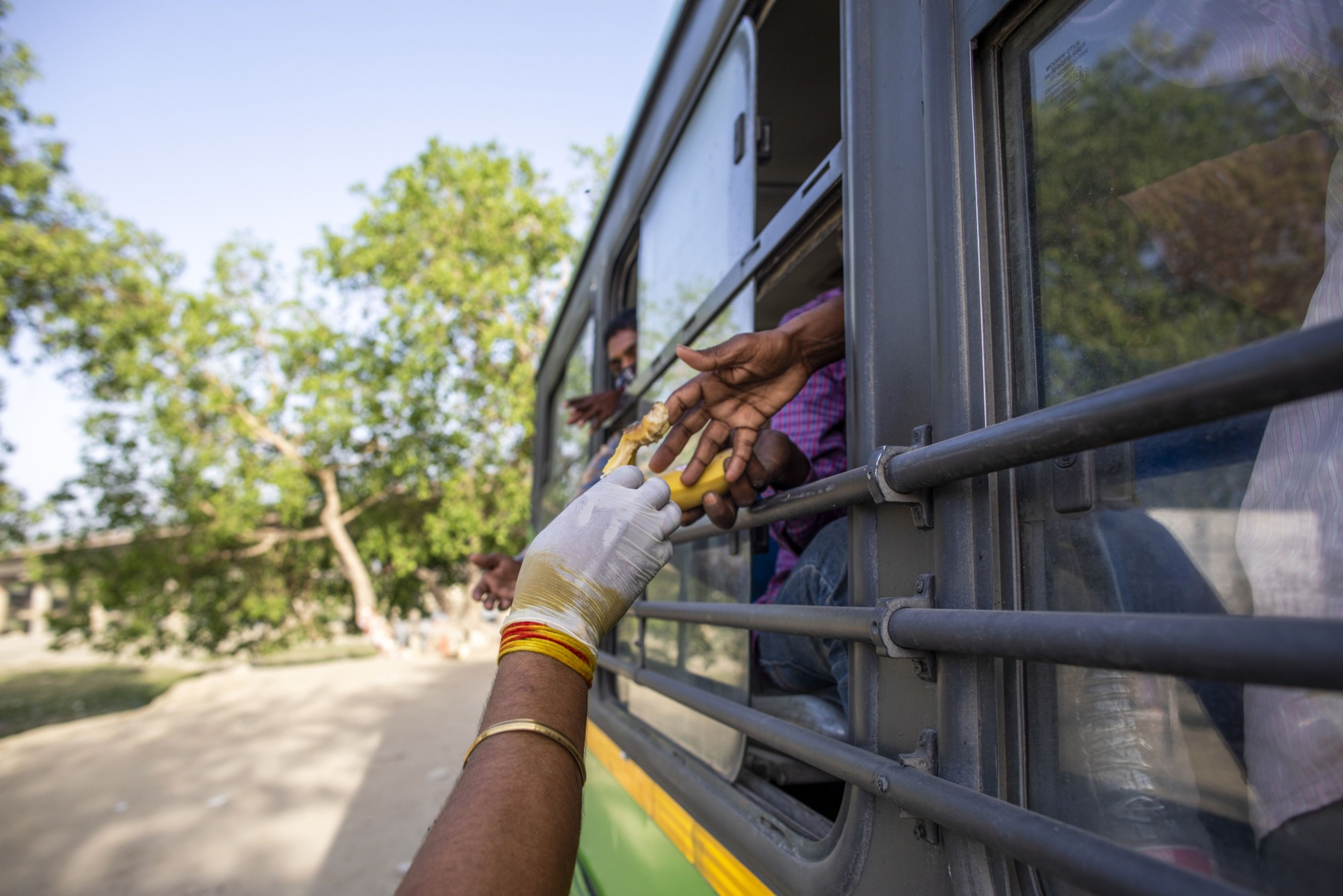 A police officer distributes bananas to people waiting in a bus on the banks of Yamuna River while being transferred to a shelter during a lockdown imposed due to the coronavirus in New Delhi, India, on Wednesday, April 15, 2020. (Photographer: Prashanth Vishwanathan/Bloomberg)