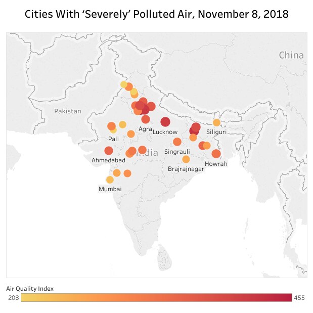 About 41 cities, mostly in north and central India, experienced “poor” to “severe” air quality on Nov. 8, 2018, a day after Diwali, according to government data.