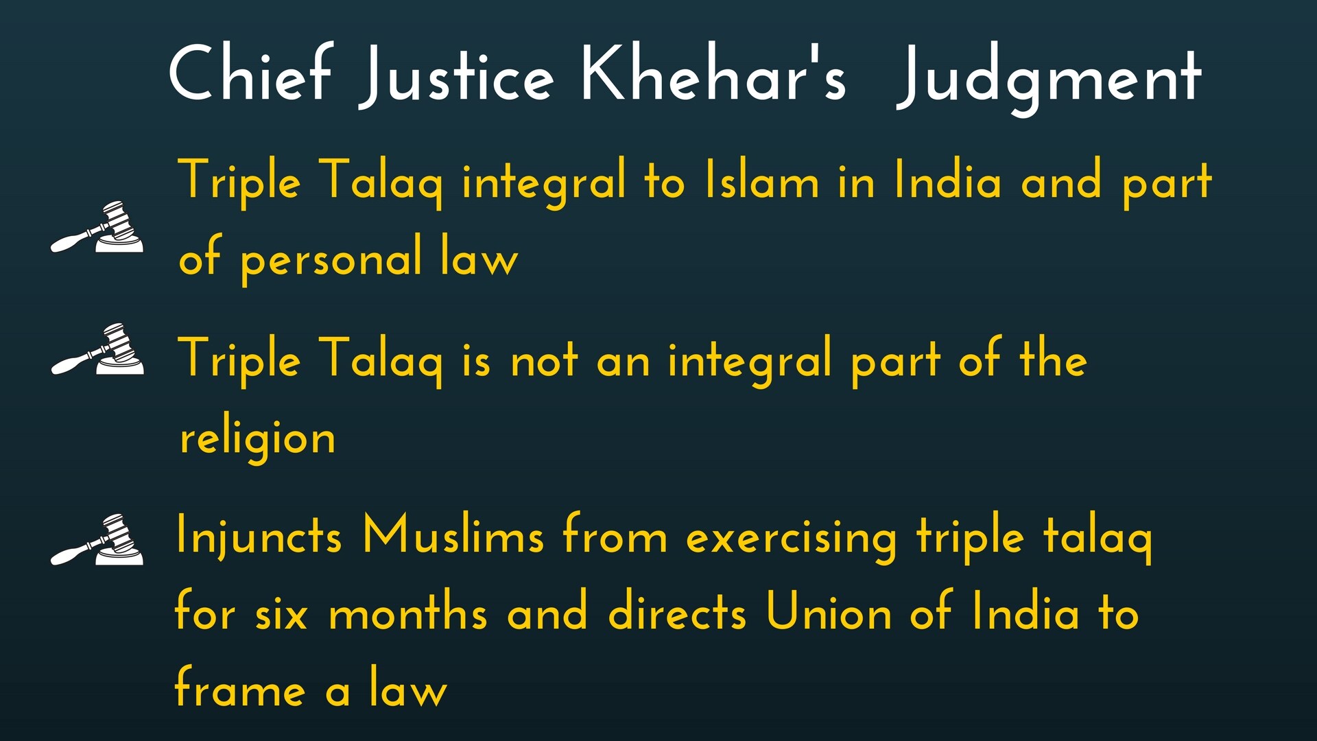 Justice Khehar set a six-month deadline for the framing of a law, during which the Union government would be mandated to draft and enact a Muslim divorce law. Failing this, the injunction would lapse.