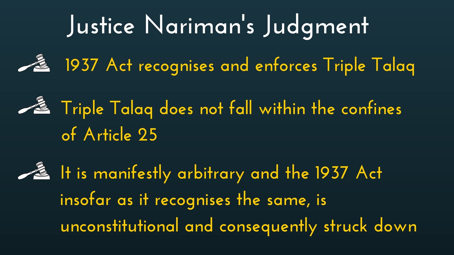 According to Justice Nariman, Shariat, including provisions of talaq, applies to Indian Muslims because of the 1937 Act, which means it should be subject to the same scrutiny as other laws made by the government. This empowers the court to strike down Triple Talaq for violating the constitution.