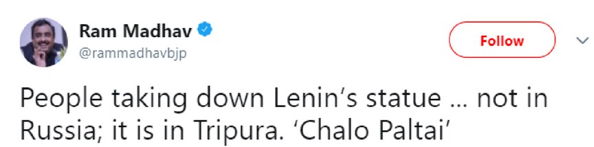 On 6 March, a video emerged showing right-wing supporters razing down a statue of communist icon Vladimir Lenin with an excavator machine in the state's Belonia town. The video shows the statue, located in the Belonia College Square, being torn down by people wearing t-shirts reading “Chalo Paltai”, while raising chants of “Bharat mata ki jai.”