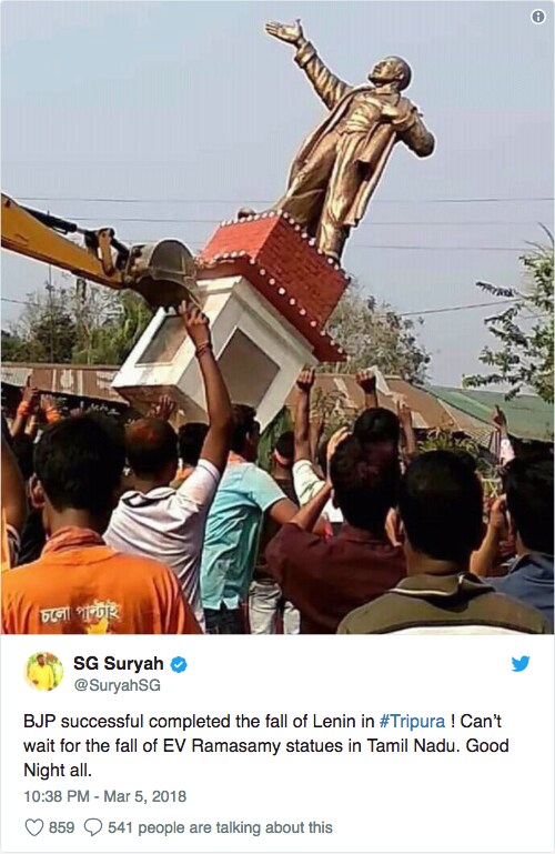 In his tweet, Suryah wrote: “BJP successfully completed the fall of Lenin in #Tripura! Can't wait for the fall of EV Ramasamy statues in Tamil Nadu.”