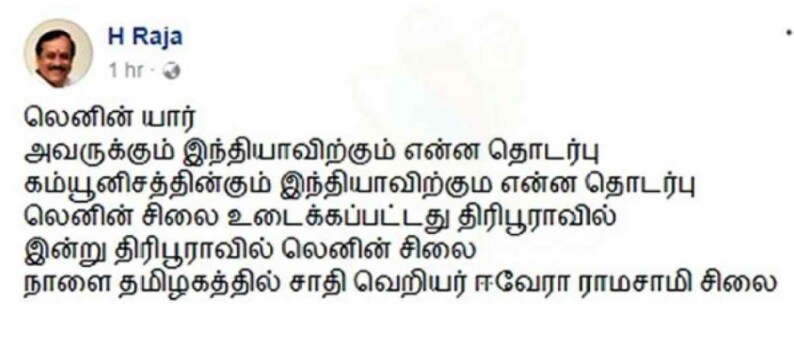 I strongly condemn what happened to brother Lenin statue at Tripura. The Tamil Nadu government should take action against H Raja whose statement says that Periyar statue will be removed as like as Lenin statue. Periyar is not a Name or statue or physical being. But it's a philosophy and lives in our hearts as principle of working class people, eradication of caste and empowerment of women society. Fix the date and time, we the living periyar ready to face anybody who are all against Periyar.D Raja Blames Instigating Facebook Message on His Page Admin